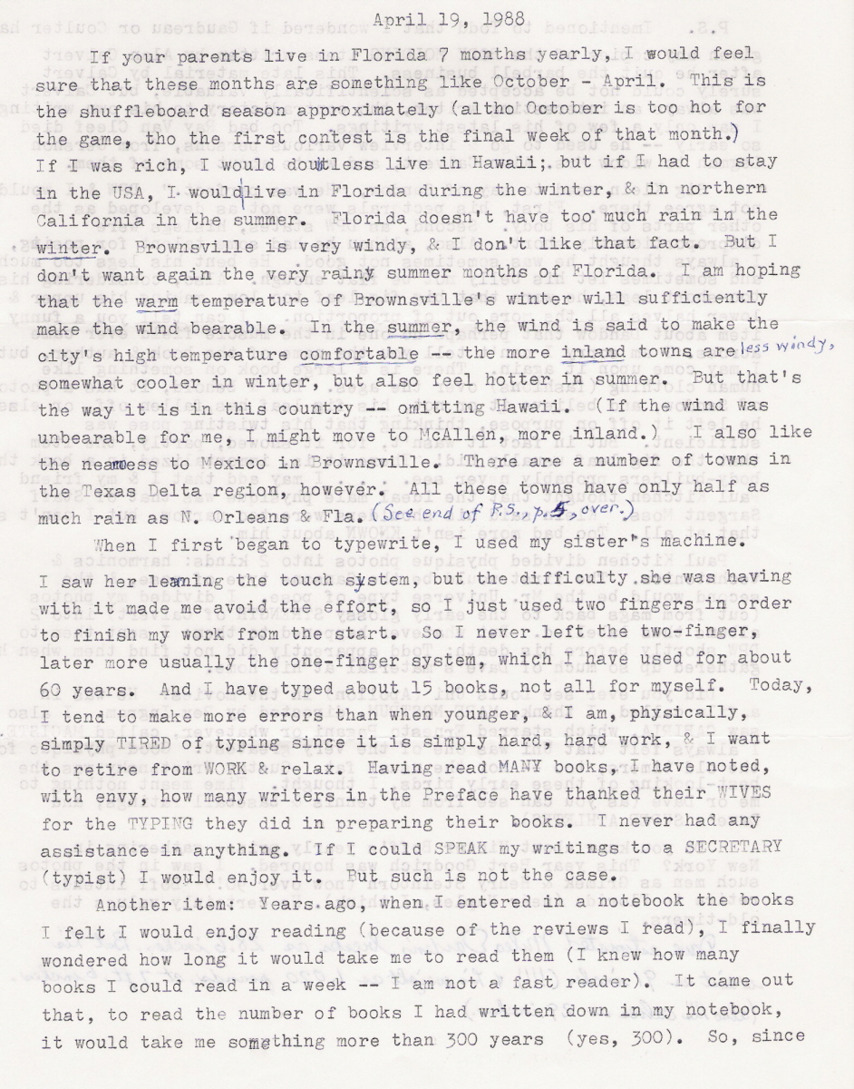 Here are the first two pages of the last letter that Weaver sent to me. This is dated April 19, 1988. His idea about calculating how many book you can read in your remaining lifetime is interesting!