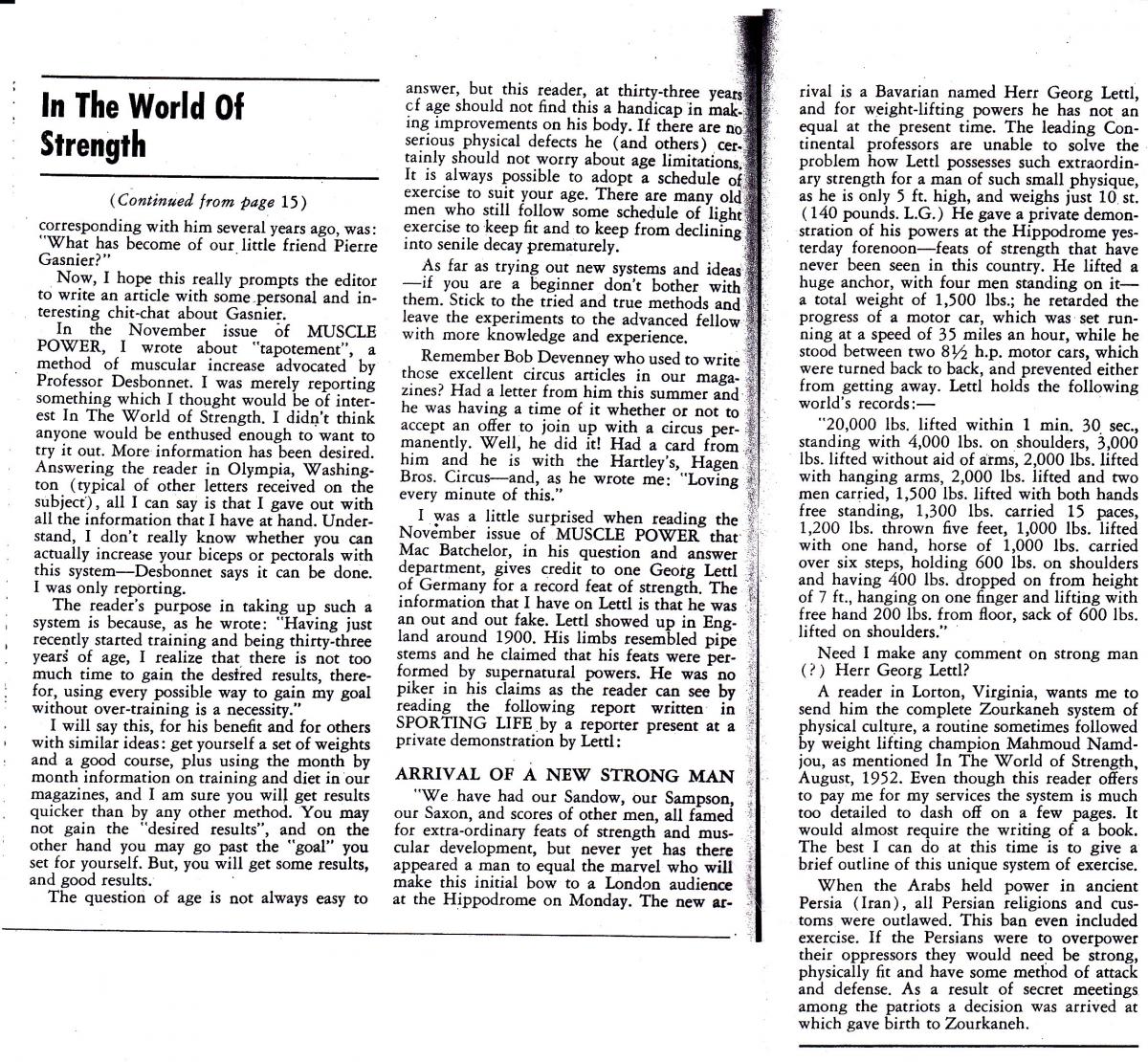 [Previous entry: "9/2/2011: In the World of Strength" by Leo Gaudreau from Muscle Power December 1952"] [Main Index] [Next entry: "9/16/2011: In the World of Strength, by Leo Gaudreau, Muscle Power July 1953"]
