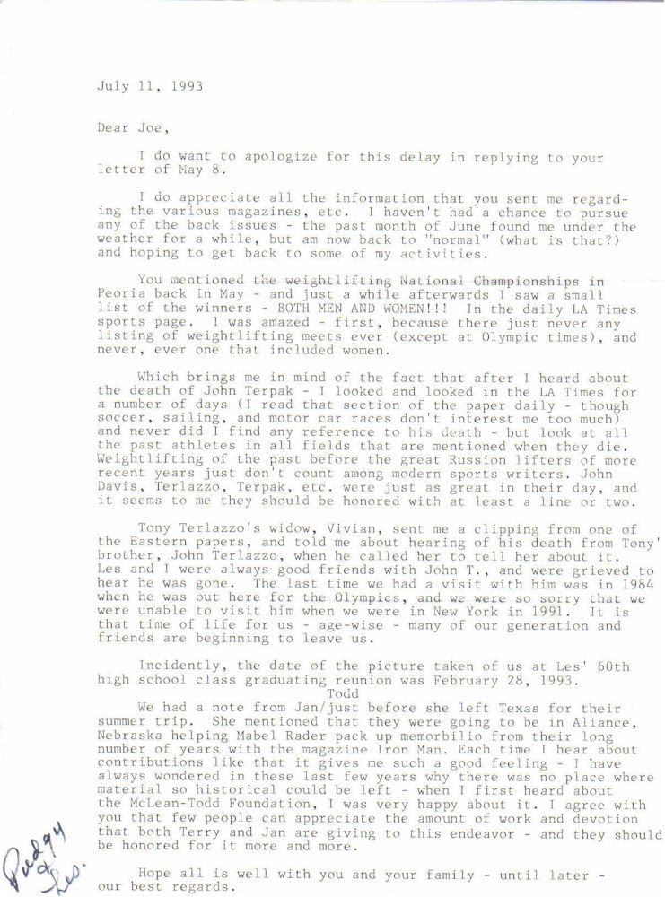 [Previous entry: "11/19/2004: Letter from John Grimek to Joe Roark May 16, 1985"] [Main Index] [Next entry: "12/3/2004: Letter from Pudgy & Les Stockton to Joe Roark July 22, 1993."]