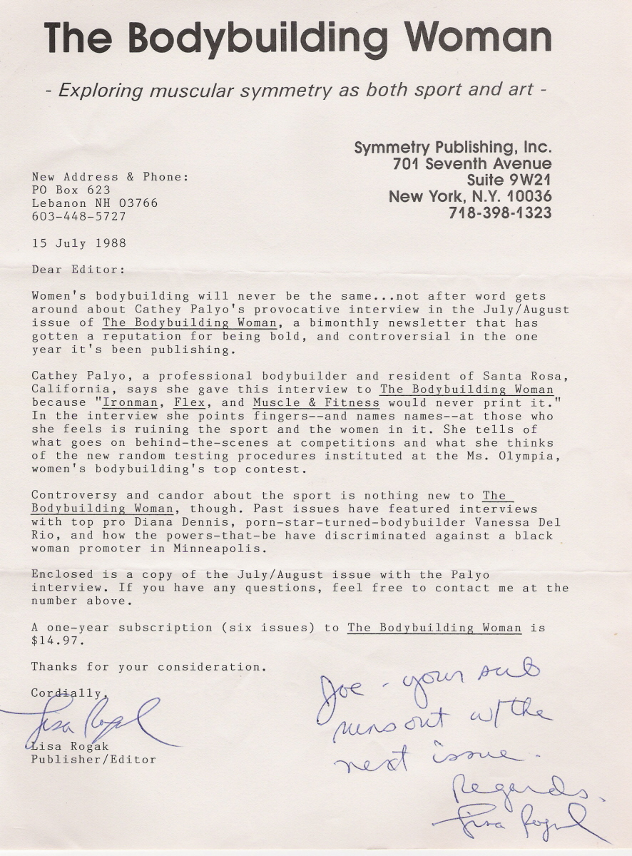 After a year of publishing 'The Bodybuilding Woman' Lisa sent a new press release in July 1988, trying to stimulate interest in the publication, and you can see her note to me that my sub was about to expire. I renewed it, and now have a complete collection of the title.
