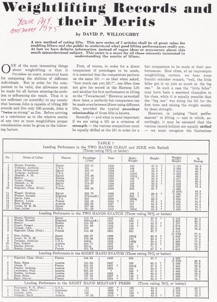 Page 1 of Willoughby's 'Weightlifting Records and Their Merits' article from Your Physique April/May 1945.