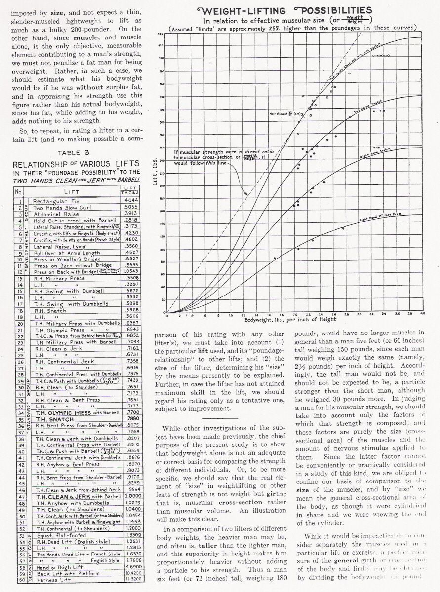 Willoughby's chart for 'Strength (lifting power) in relation to Muscular Cross-Section or weight divided by height expressed in terms of lifting limits (lbs.) in the Two Hands Clean and Jerk with Barbell.