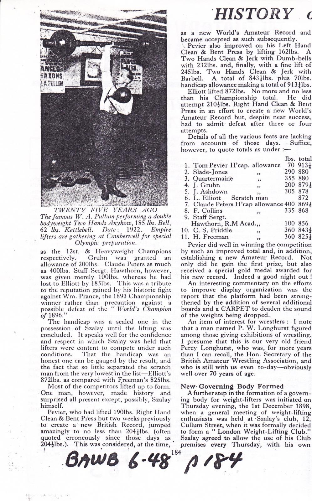 [Previous entry: "2/24/2012: The British Amateur Weightlifter & Bodybuilder: May 1948: The Evolution of Class-Weight Championships"] [Main Index] [Next entry: "3/16/2012: The British Amateur Weightlifter & Bodybuilder: The 1901 British Championships, the Pevier-Elliott Era Continues, BAWB July 1948"]