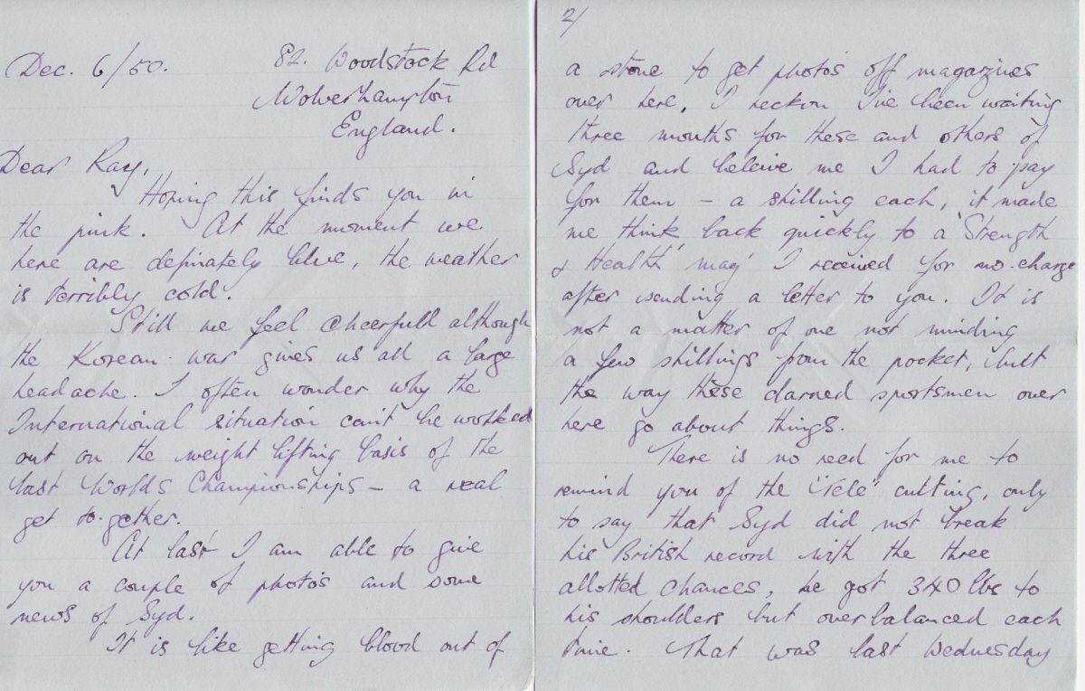 Pages one and two of a letter from Syd and Tom Harrington to Ray Van Cleef, December 6, 1950. Part 1 is this week.